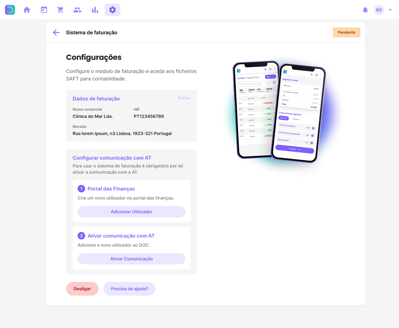 Se recebeu uma mensagem de sucesso e o Modulo ficou “Ativo” (pode ver no canto superior direito), já pode emitir faturas através do DOC, nesta área pode também fazer download dos ficheiros SAF-T todos os meses, ou selecionar a opção para automatizar esse envio para a AT, desta forma não tem de se preocupar com essa comunicação. Sugerimos falar com o seu contabilista para saber qual a melhor forma de trabalhar.